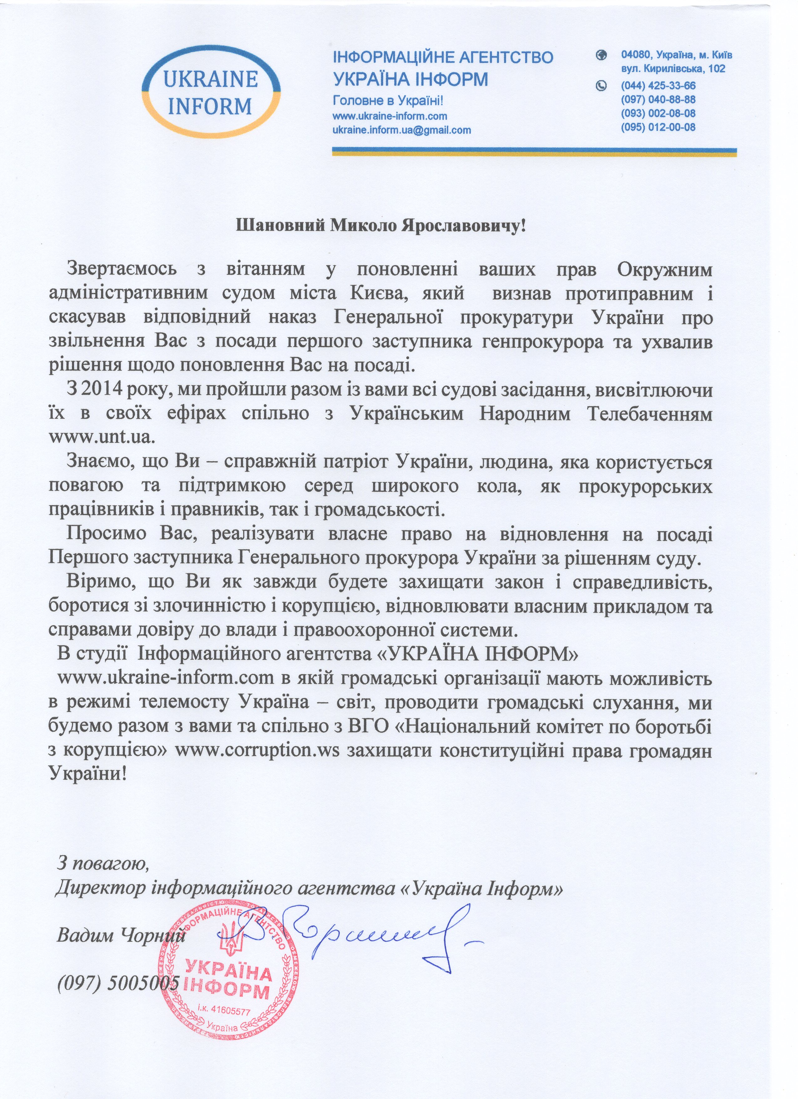 Окружний адмінсуд Києва поновив Миколу Голомшу на посаді першого заступникагенпрокурора України! Визнав протиправним та скасував наказ Генпрокуратури про його звільнення з посади першого заступника генерального прокурора і ухвалив поновити Миколу Голомшу на посаді. Поздоровляємо Миколу Ярославовича! Правда перемогла!