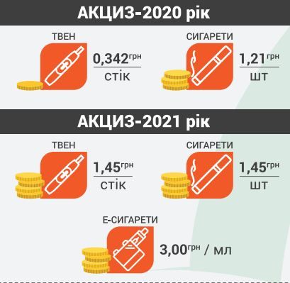 Міністерство фінансів сформувало Держбюджет на 2021 р. з очікуваними надходженнями у розмірі 5,1 млрд грн від усіх ввезених із закордону тютюнових виробів (куди входять ТВЕН) та рідин до електронних сигарет. Всього за перші 3 місяці січень-березень 2021 р. Державна казначейська служба України звітує про надходження до Держбюджету 2,7 млрд грн (52% доходів від запланованого на рік) за цією статтею доходів.